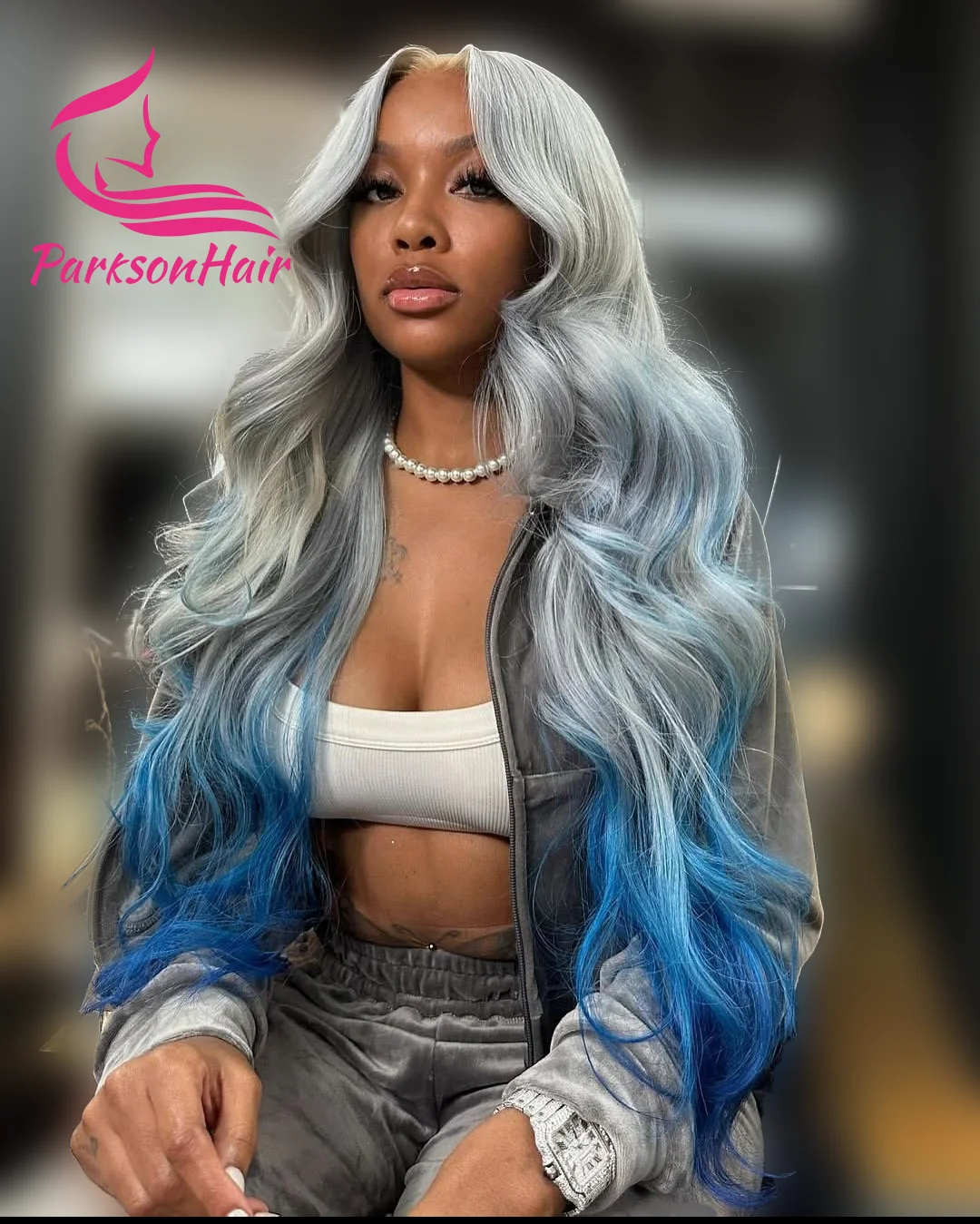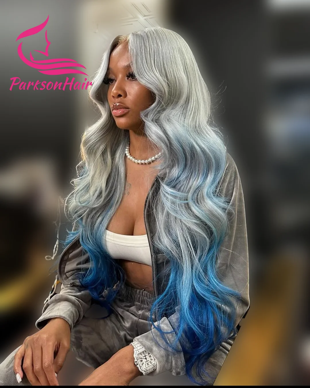 ParksonHair Gradient Gray Blue 13X6 Regular Lace Front Wig Body Wave Virgin Hair Ombre Color Grey/Blue Human Hair Wig For Women